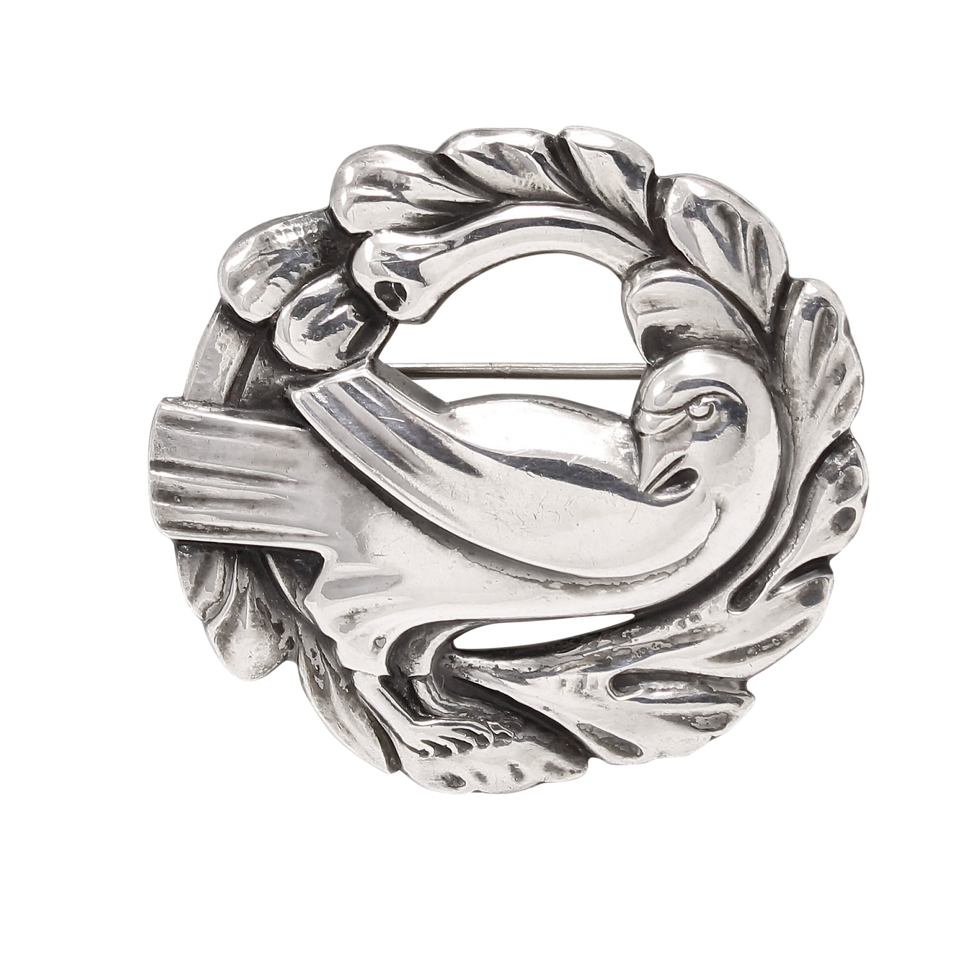An extremely well done likeness of the iconic Georg Jensen Dove brooch. The details of the birds feathers and features have been beautifully captured as well as those of the encompassing wreath.
