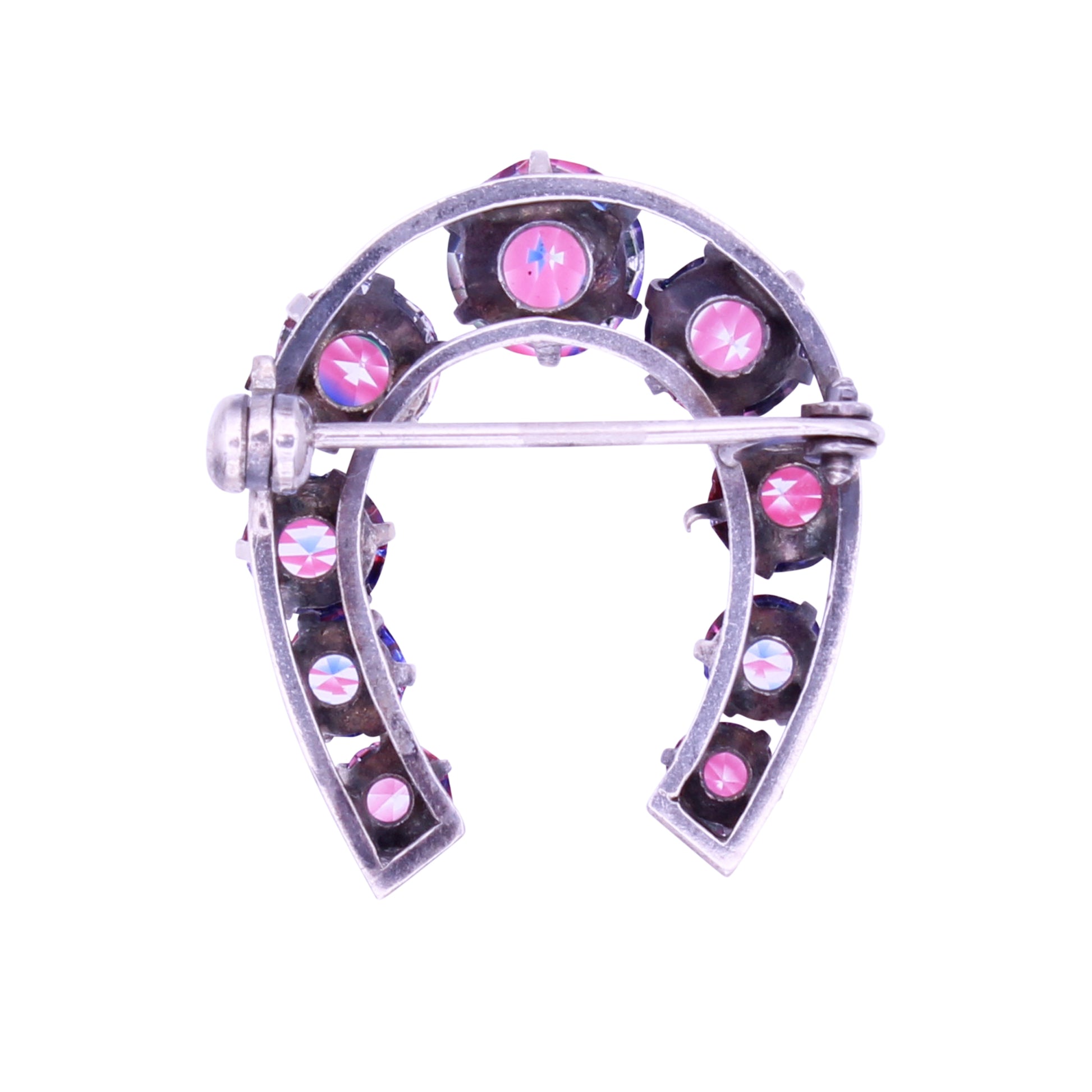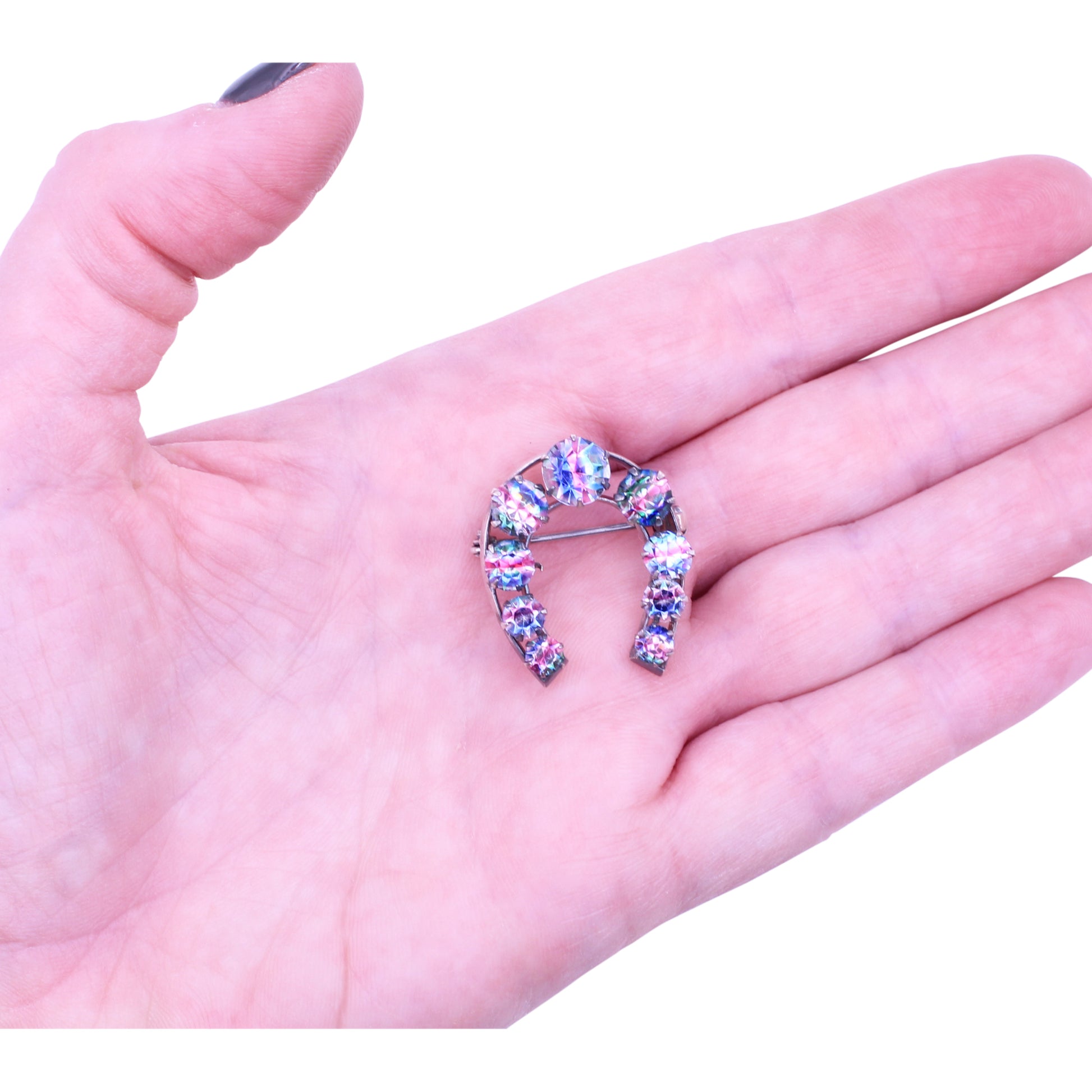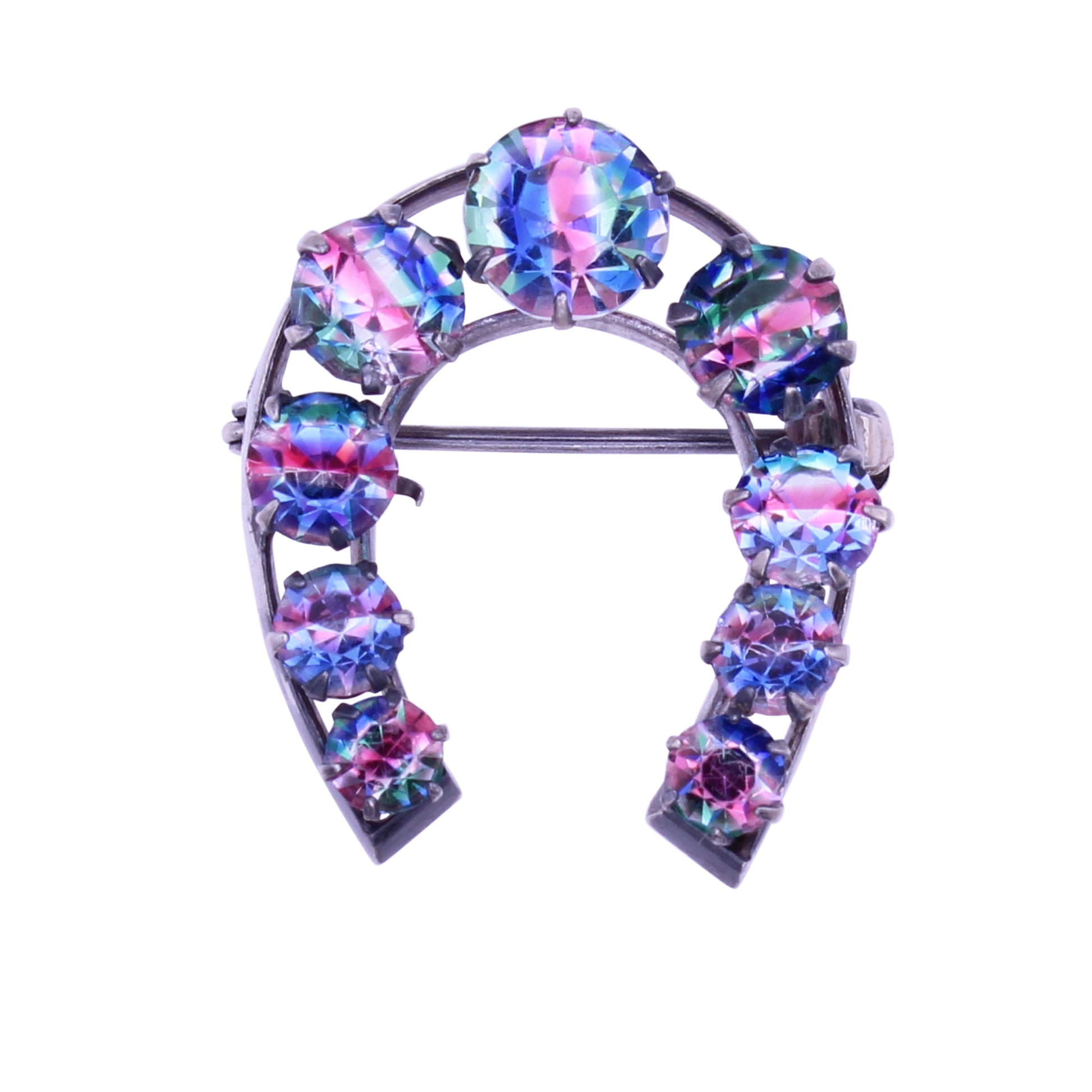 An Iris glass rhinestone 850 silver horseshoe pin is is not only lucky but colorful. Iris glass rhinestones are renowned for their multicolored appearance. Their brilliance mimics a rainbow with blues, greens, reds, and a slight hint of yellow.. These stones are faceted to maximize their play of light and color. The stones are prong set in a row along the curve of the horseshoe. The size graduates in size along with the horseshoe shape.