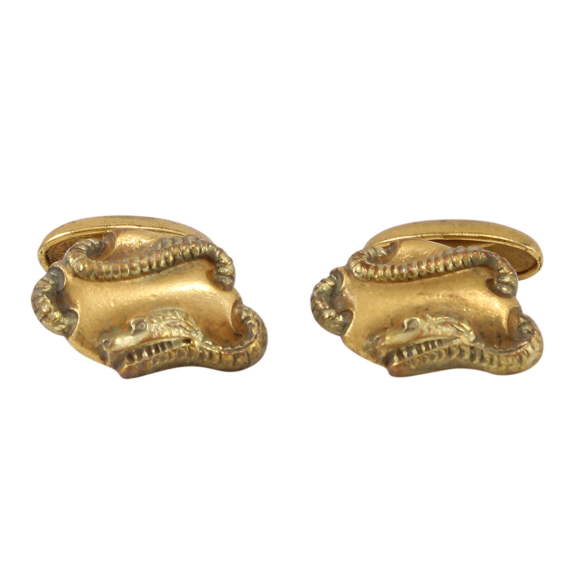 A snake design Influenced by recently unearthed archeological treasures of the time, these serpents winding bodies twist and coil on these fierce cufflinks. The gold fill has a matte appearance that was popular during the late Victorian era.