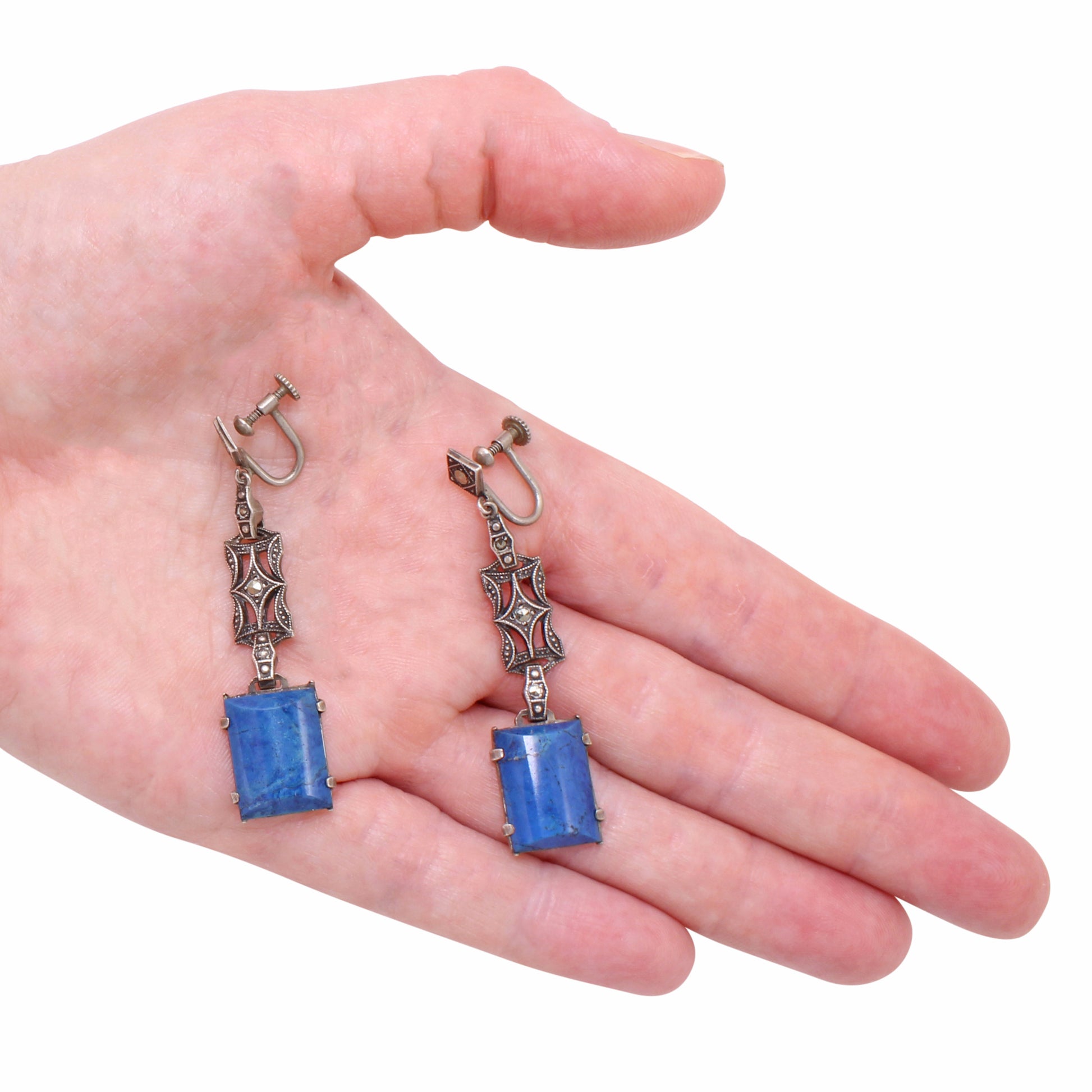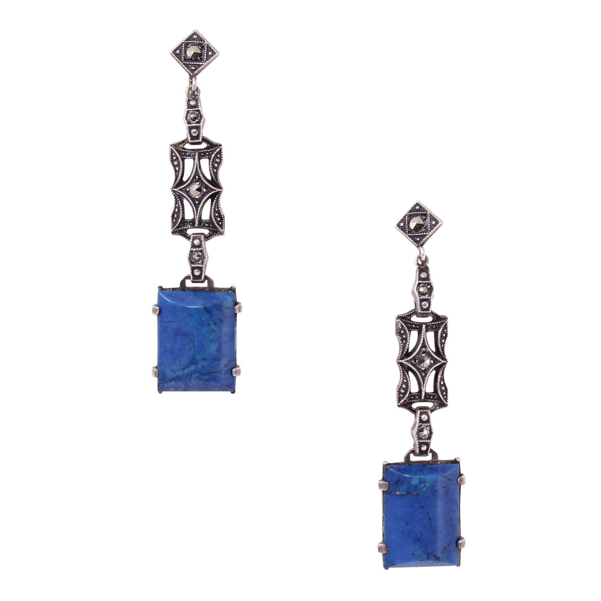 Art Deco Sterling Silver Blue Agate and Marcasite Earrings