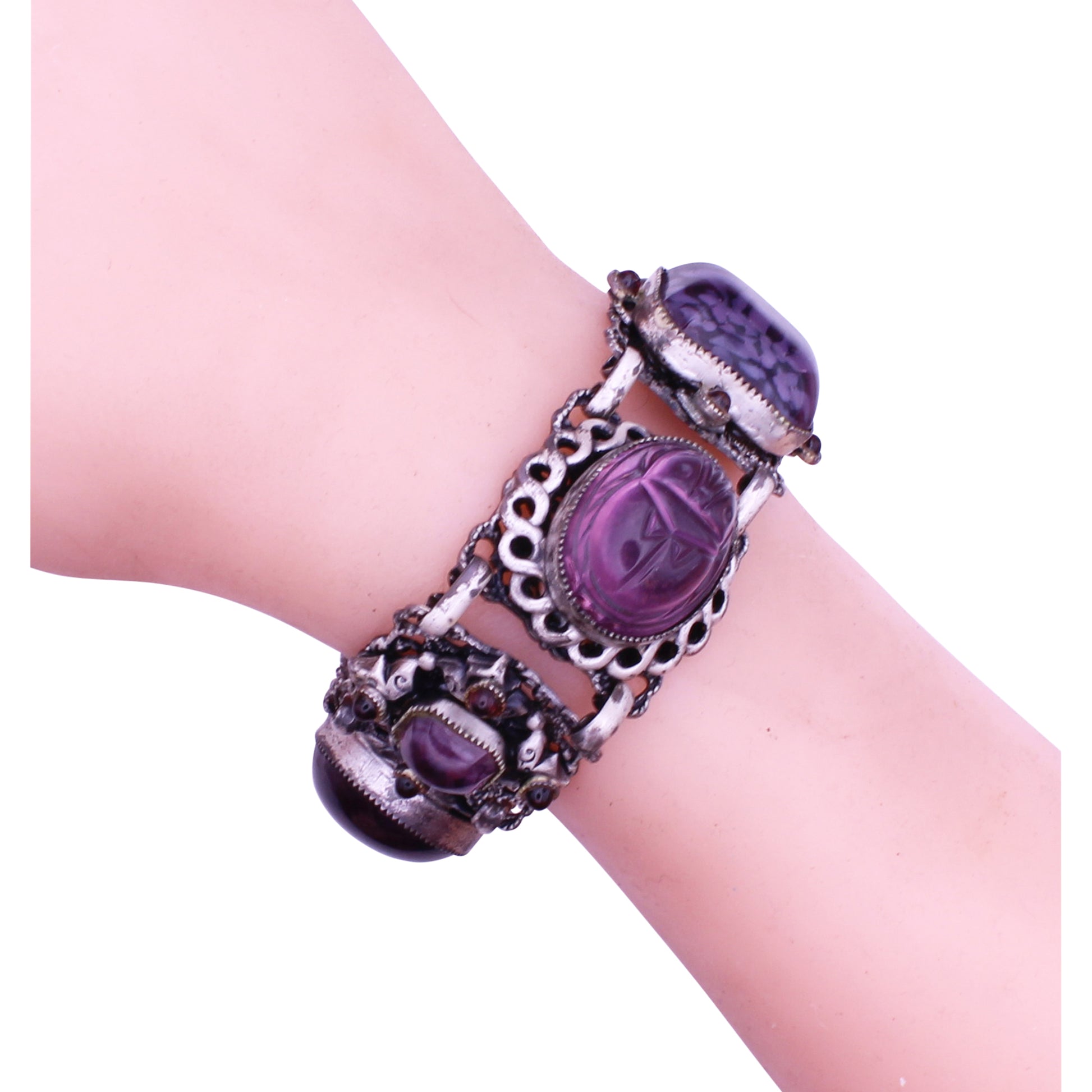Amethyst Glass Scarab and Cabochons Filigree Bracelet and Earrings