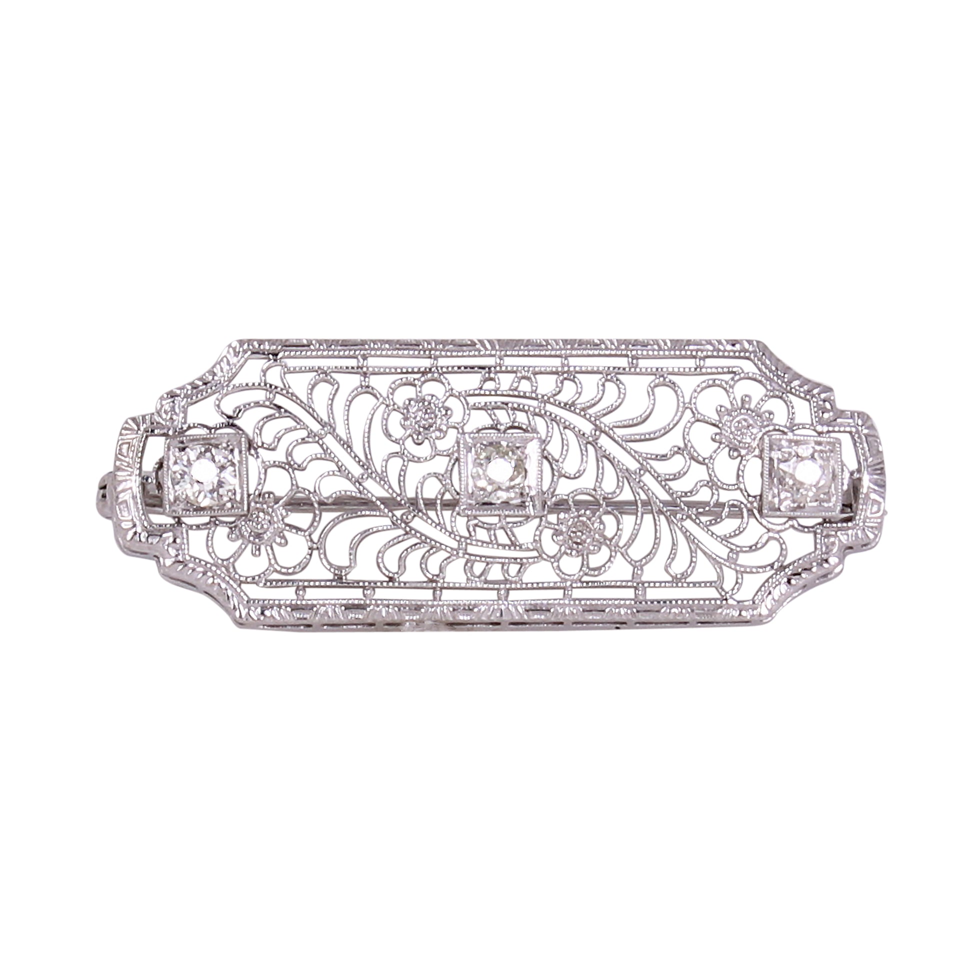 Exquisite metal work reveals leafy vines and flowers that weave through this elegant brooch. Three old European cut diamond are set in millegrain finished frames and add some sparkle to the presentation.