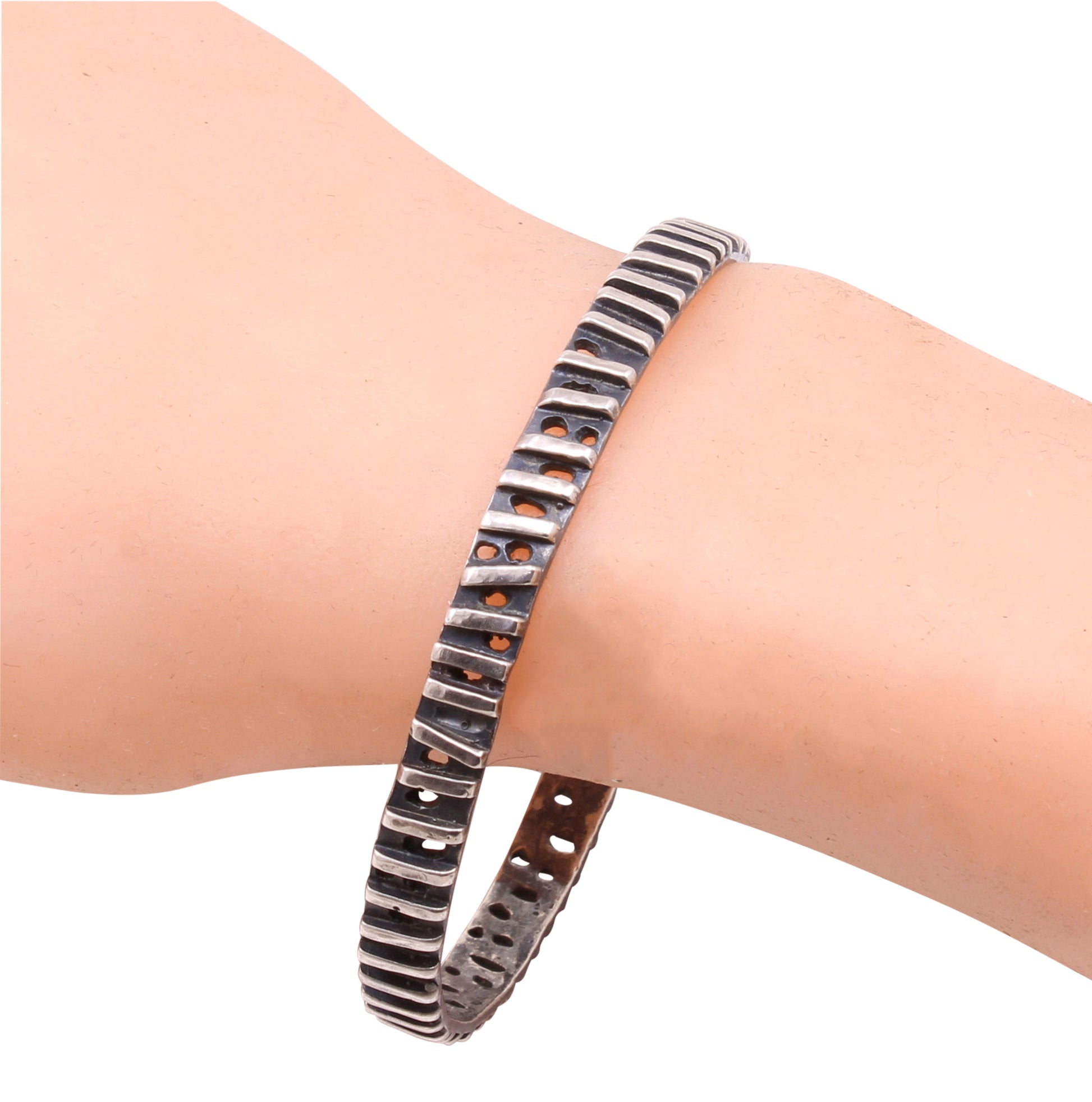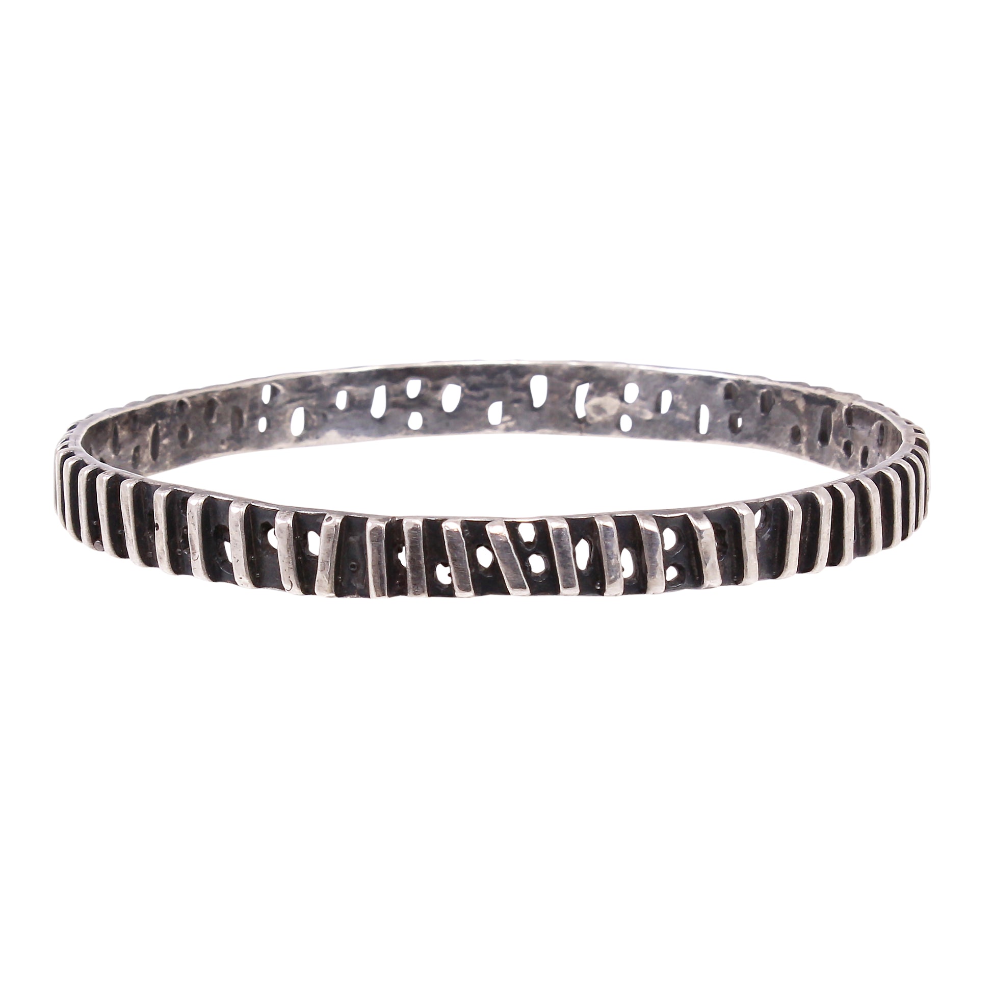 Pierced metal work is accented by bars on this interesting Mid-Century sterling bracelet. The bars are not perfectly aligned for a unique presentation. The recesses have been oxidized adding depth.